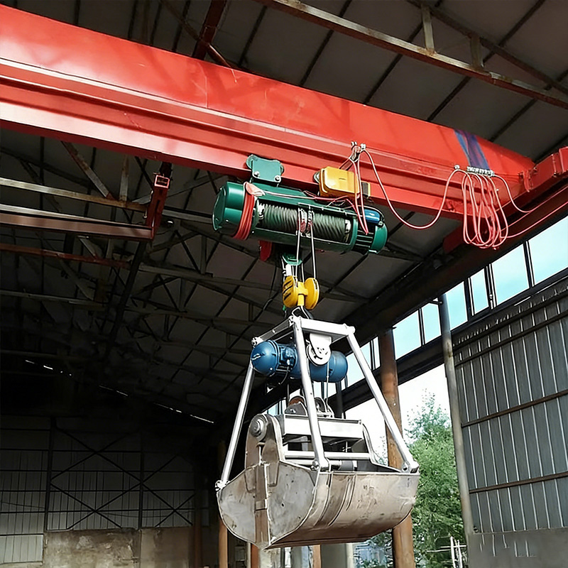起重小車:沿主梁下翼緣軌道橫向移動。小車上的起升機構(gòu)通過鋼絲繩控制抓斗的開降,開閉機構(gòu)則控制抓斗的張開與閉合,以抓取和釋放物料。